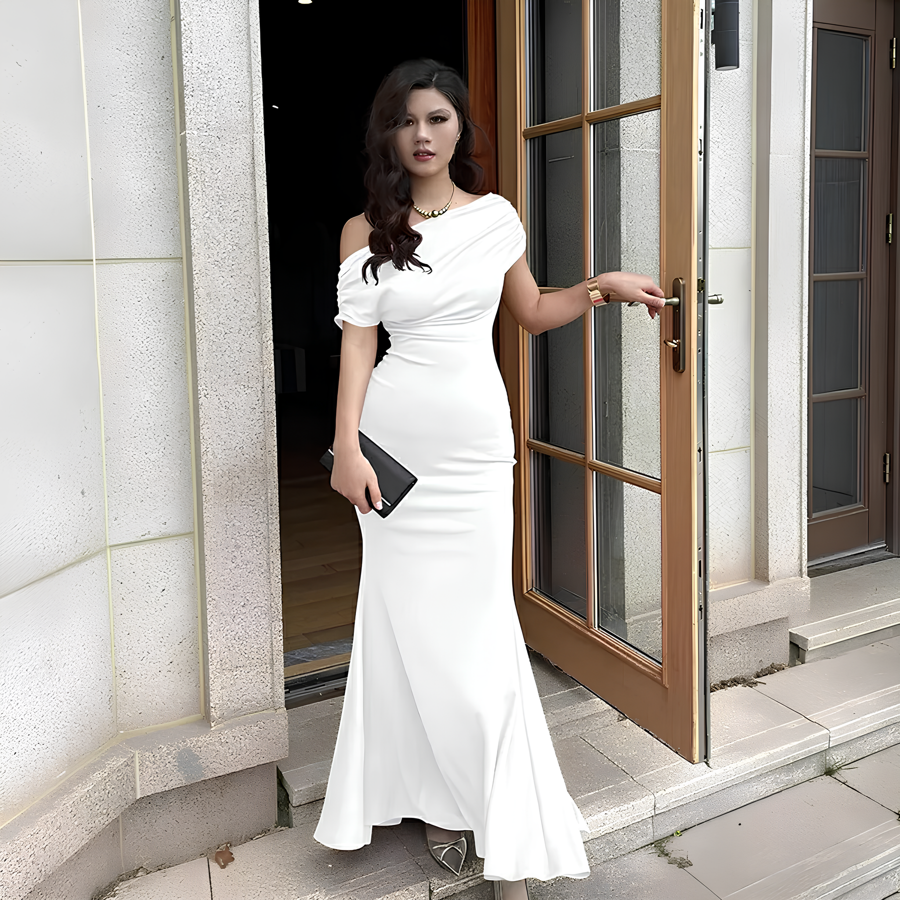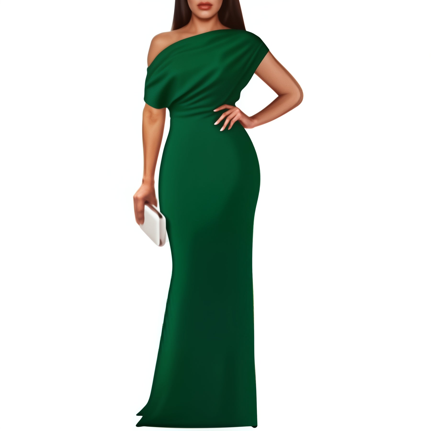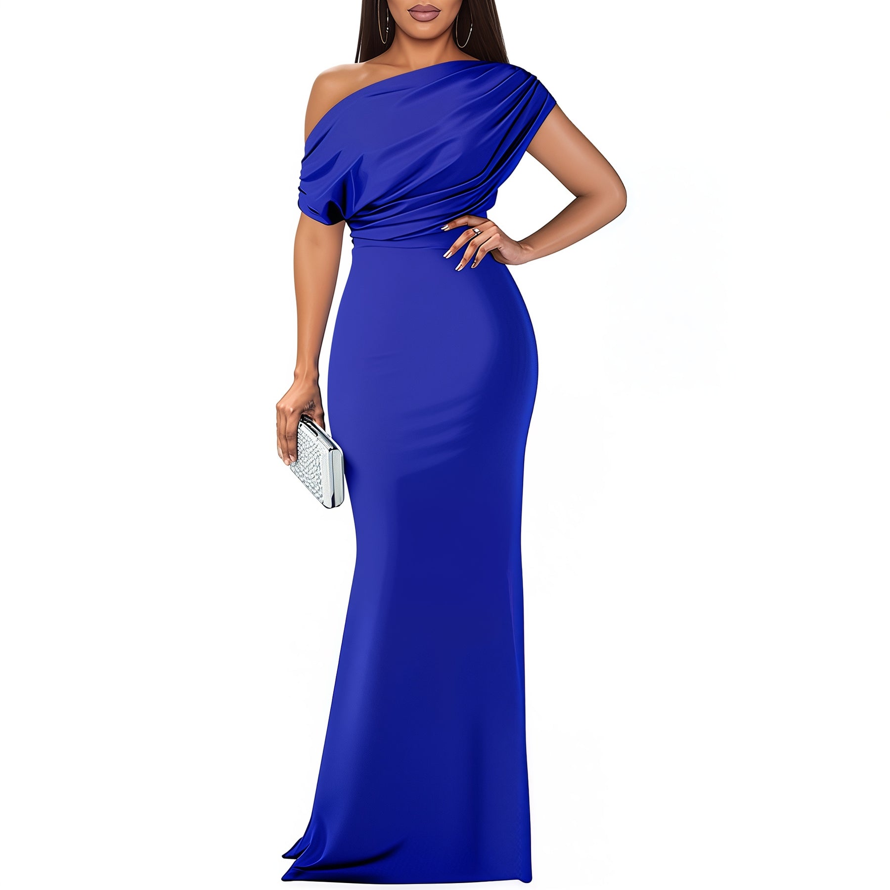 This elegant one-shoulder gown features a slight stretch that allows the premium satin fabric to beautifully sculpt your silhouette. The touch of elastane ensures the gathered shoulder draping sits perfectly in place, while the ruched waist detail contours flawlessly to your body. The bodycon fit glides smoothly from waist to floor, creating that coveted sleek, figure-hugging look without feeling restrictive. This thoughtful stretch means you can move, dance, and celebrate with complete confidence and comfort throughout your event. The style runs true to size, but we recommend sizing up if you prefer a more relaxed fit.